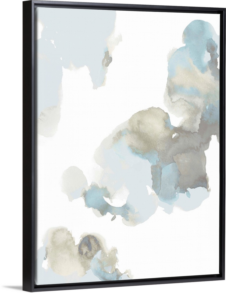 <p>Abstract painting with light blue and gray hues splattered together on a white background.</p>