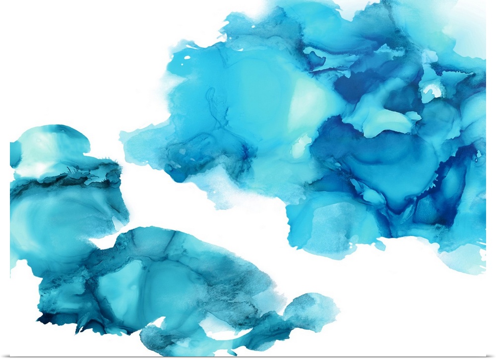 <p>Abstract painting with aqua hues splattered together on a white background.</p>