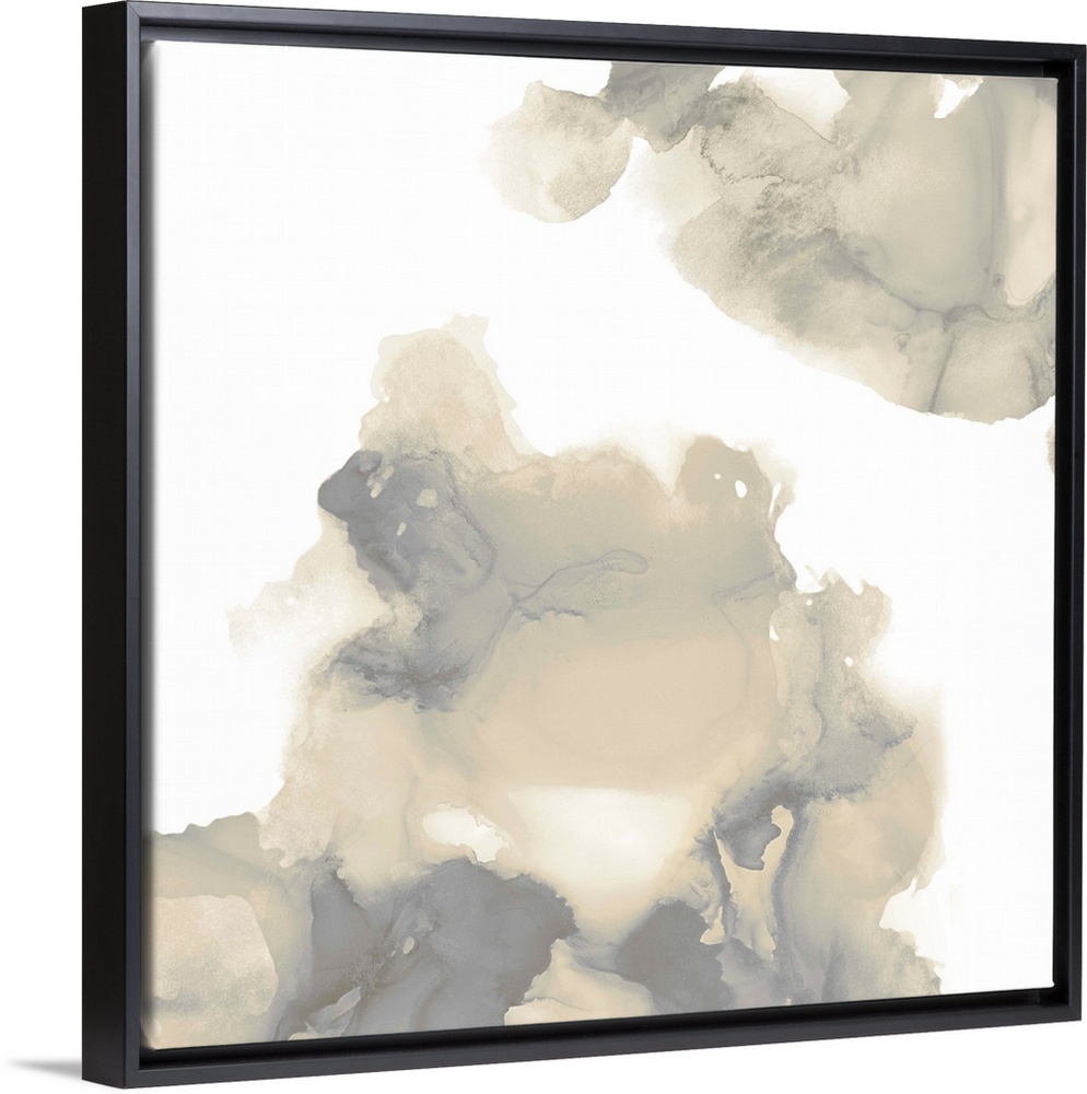 <p>Abstract painting with tan and gray hues splattered together on a white background.</p>