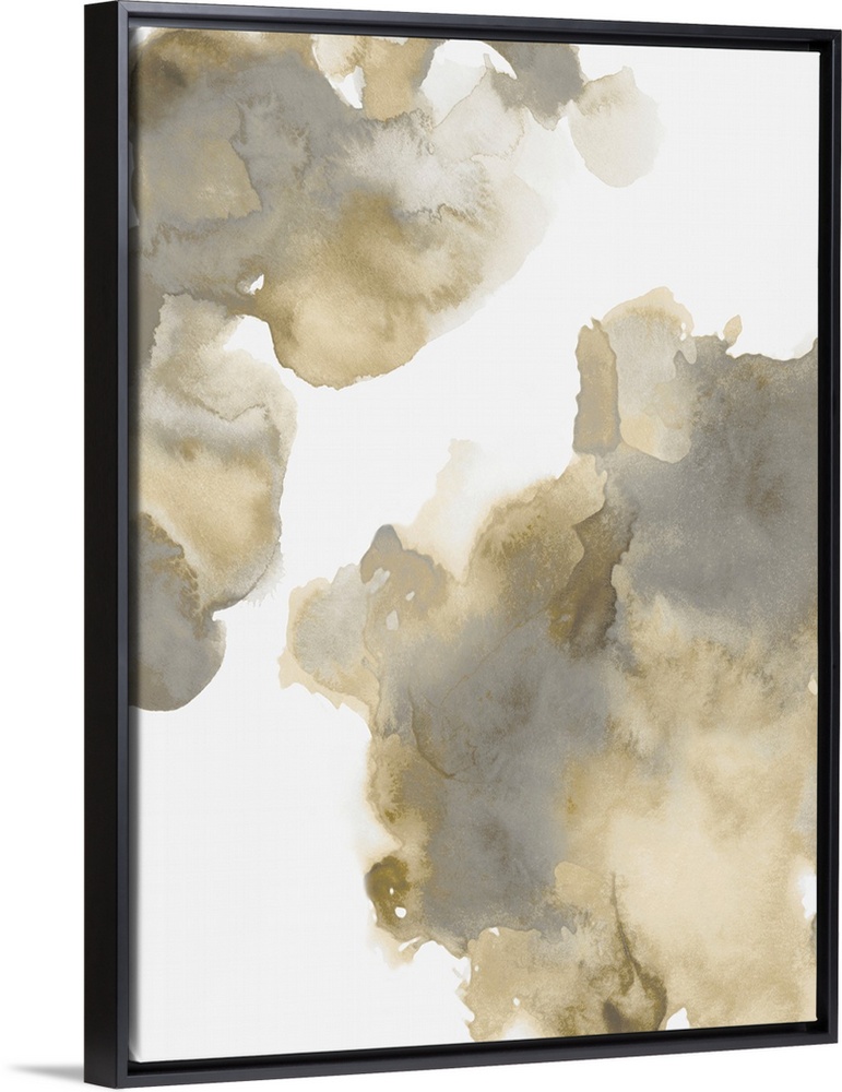 <p>Abstract painting with gold and gray hues splattered together on a white background.</p>