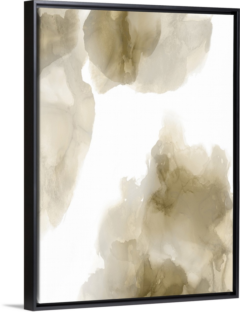 <p>Abstract painting with gold and gray hues splattered together on a white background.</p>