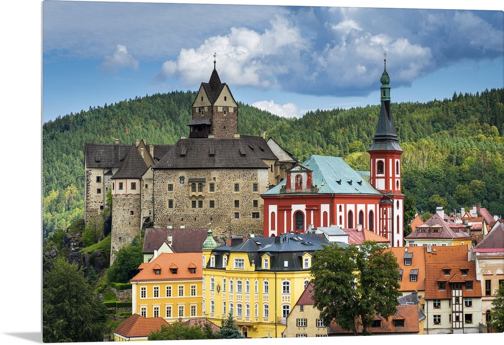 <p>Elevated scenic view of Loket Castle and St. Wenceslas Church, Loket, Sokolov District, Karlovy Vary Region, Bohemia, Czech Republic</p>