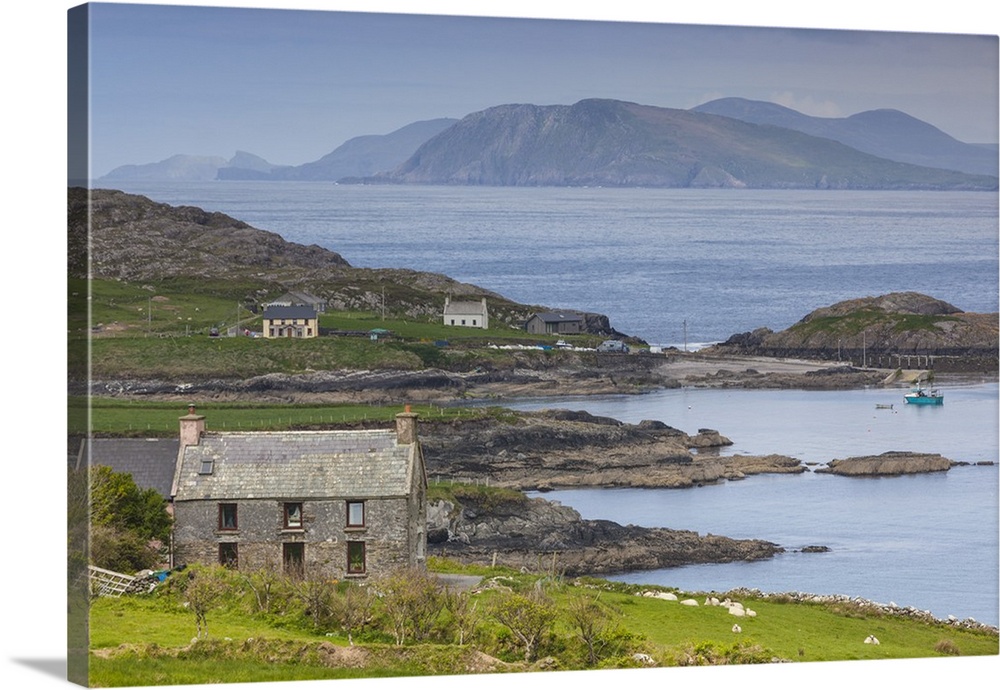 <p>Ireland, County Cork, Beara Peninsula, Ring of Beara, Garinish, elevated view of Ballydonegan Bay.</p>