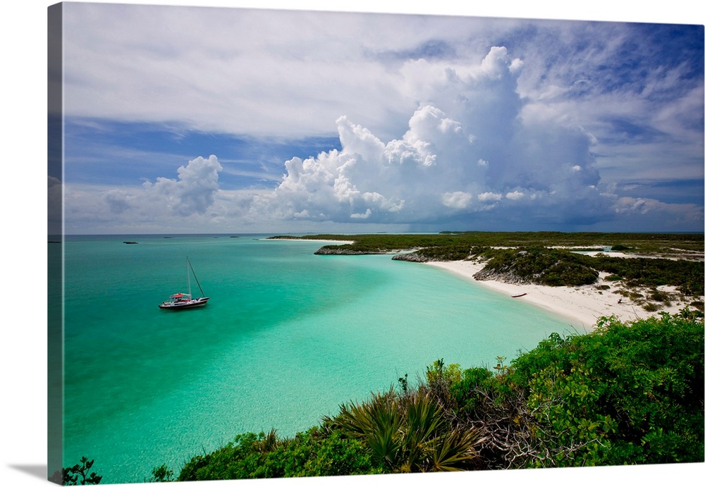 Elevated view of boat in Caribbean Sea, Great Exuma Island, Bahamas
