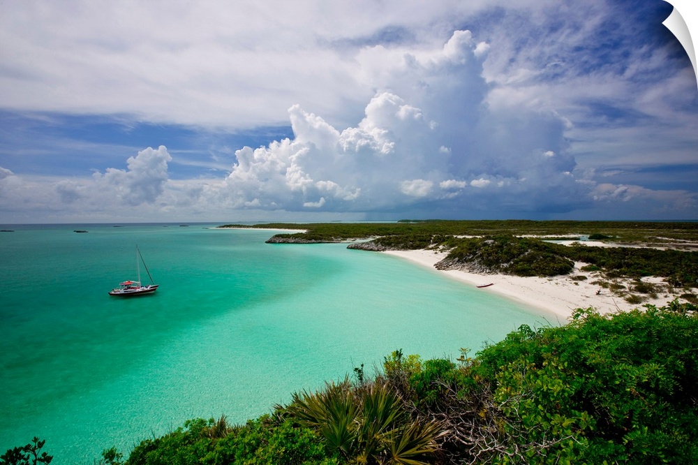 <p>Elevated view of boat in Caribbean Sea, Great Exuma Island, Bahamas</p>