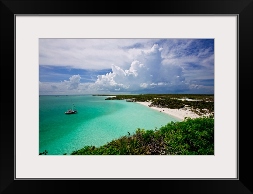 <p>Elevated view of boat in Caribbean Sea, Great Exuma Island, Bahamas</p>