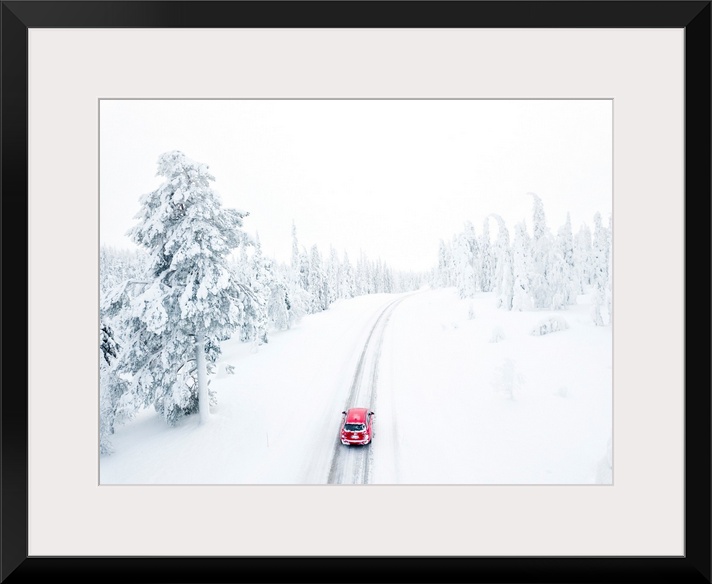 <p>Elevated view of car along the snowy road in the icy forest, Pallas-Yllastunturi National Park, Muonio, Lapland, Finland.</p>