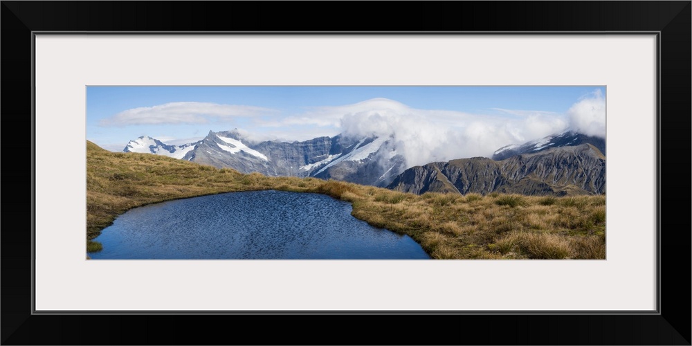 <p>Elevated view of lake on mountain, Mount Aspiring National Park, West Coast, South Island, New Zealand</p>