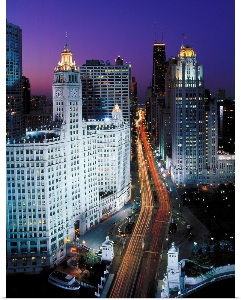 <p>Elevated view of Michigan Avenue at dusk, Chicago, Cook County, Illinois, USA</p>