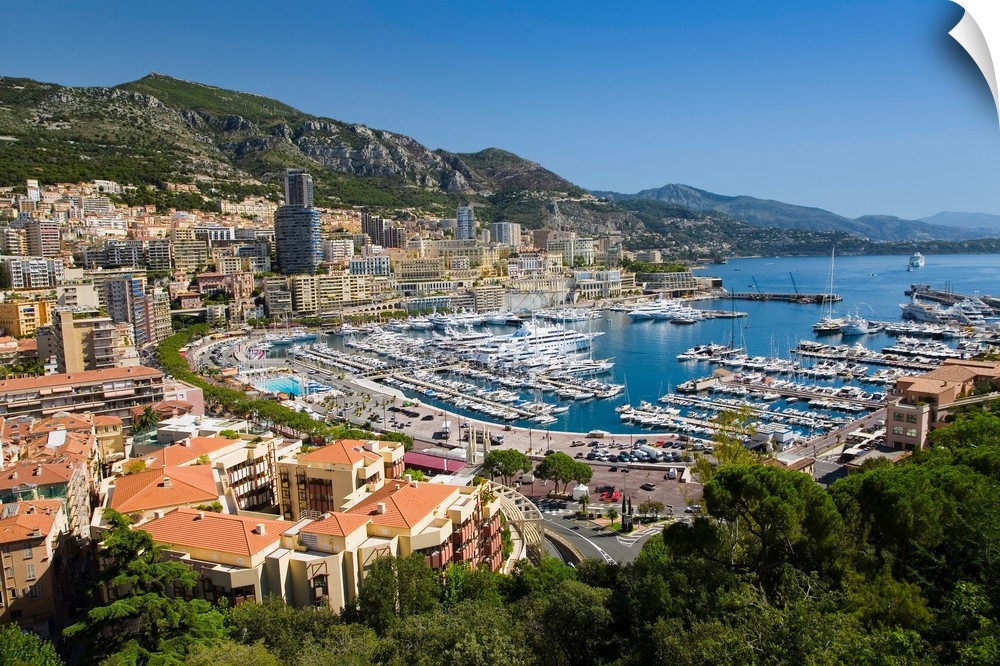 <p>Elevated view of Monte-Carlo and harbor in the Principality of Monaco, Western Europe on the Mediterranean Sea</p>