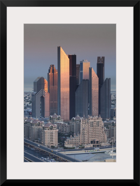 <p>UAE, Dubai, Downtown Dubai, elevated view of skyscrapers on Sheikh Zayed Road from downtown, dawn</p>