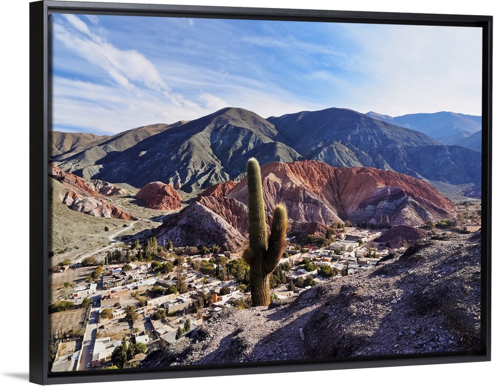 <p>Argentina, Jujuy Province, Purmamarca, Elevated view of the town and the Hill of Seven Colours(Cerro de los Siete Colores).</p>