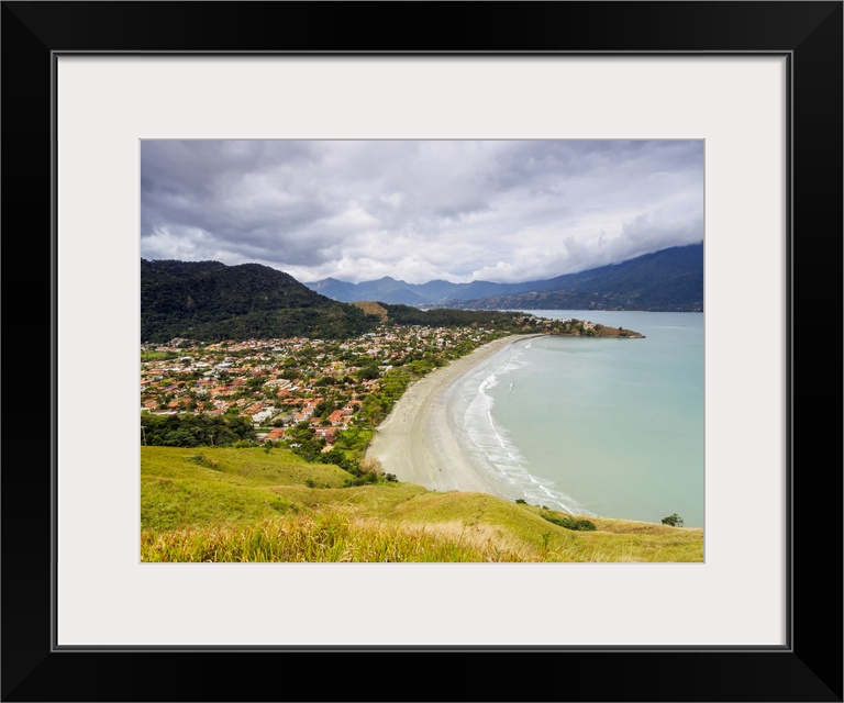 <p>Elevated view of the Praia Barequecaba with Ilhabela Island in the background, State of Sao Paulo, Brazil, South America</p>