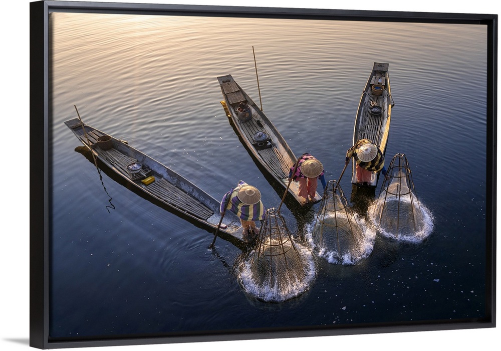 <p>Elevated view of three fishermen catching fish from boats using traditional conical nets at sunrise, Floating Gardens, Lake Inle, Nyaungshwe Township, Taunggyi District, Shan State, Myanmar</p>