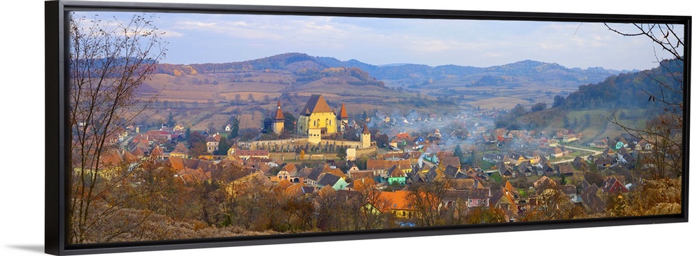 <p>Elevated view over Biertan at sunset, Biertan, nr. Sighisoara, Transylvania, Romania</p>