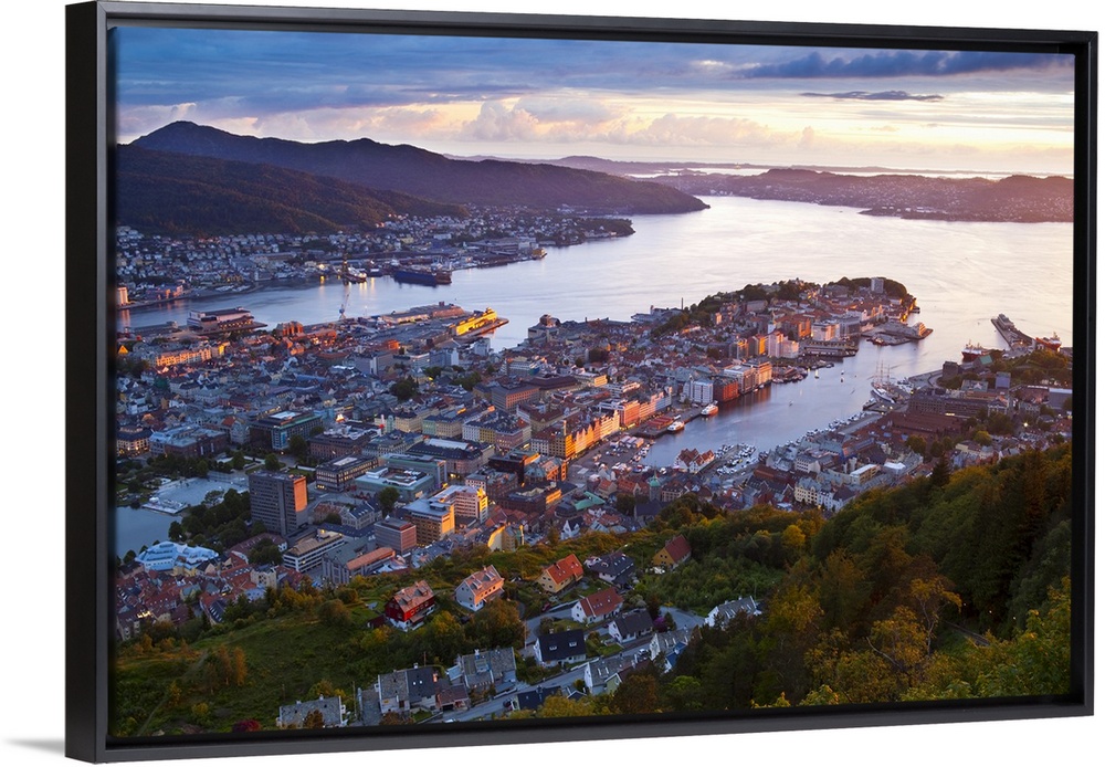 <p>Elevated view over central Bergen illuminated at sunset, Bergen, Hordaland, Norway</p>