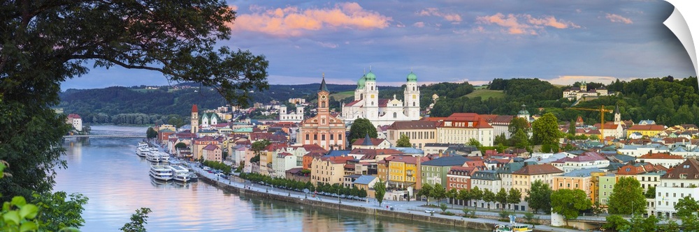 <p>Elevated view towards the picturesque city of Passau at sunset, Passau, Lower Bavaria, Bavaria, Germany.</p>