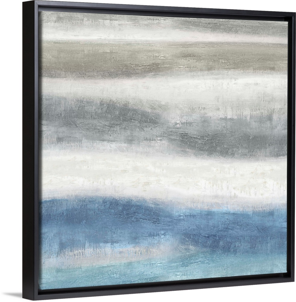 <p>Square abstract painting created with blue and gray wavy brushstrokes running horizontally across the canvas.</p>