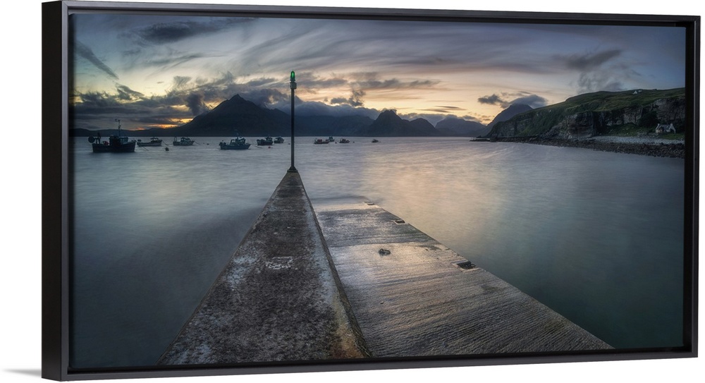 <p>Elgol pier and boats with cuillin mountains in background at dusk, isle of skye, scotland.</p>