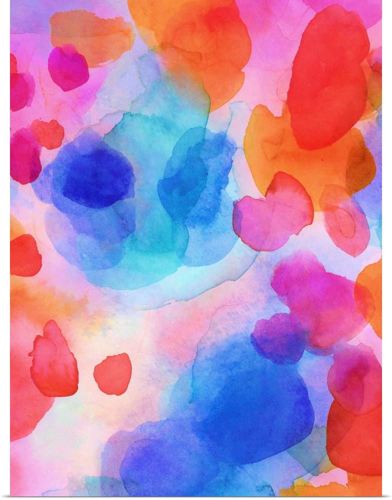 <p>A vertical abstract watercolor painting in brilliant colors of pink, orange and blue.</p>