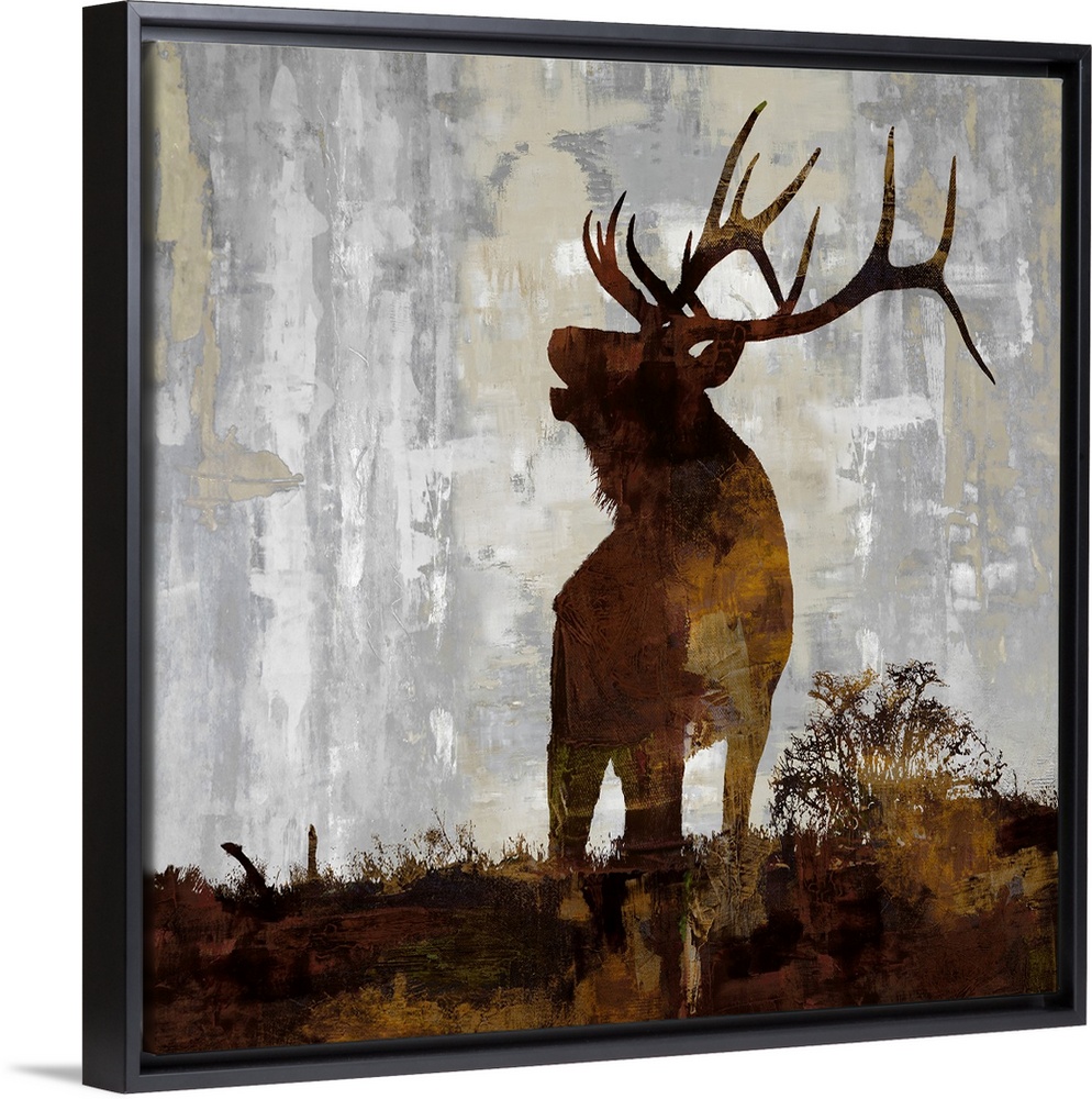 <p>Square decor with a brown and gold silhouette of an elk on a gray, tan, and white background.</p>