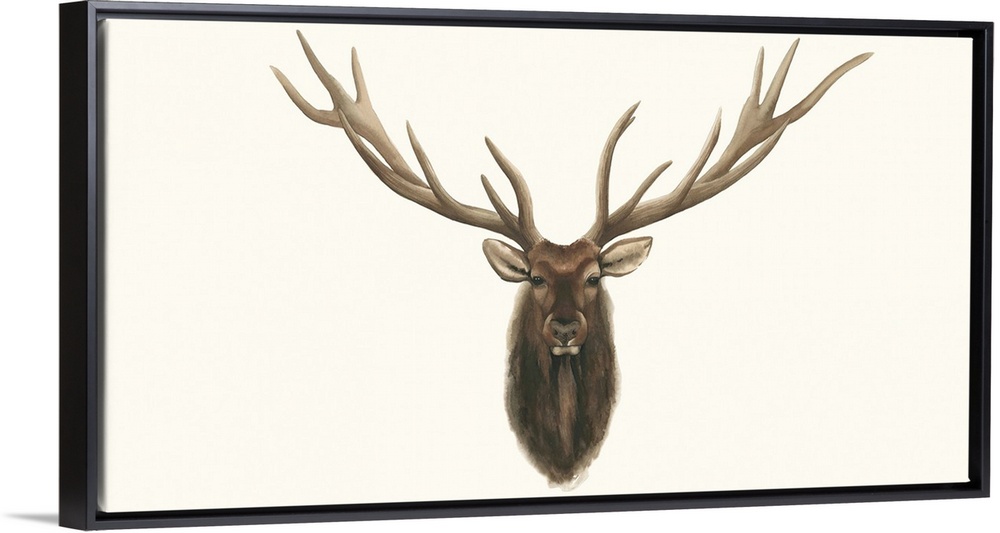 <p>Portrait of an elk with large antlers appearing to be hung on a wall like a hunting trophy.</p>