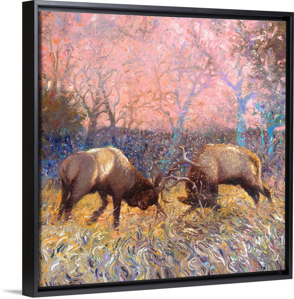 <p>Brightly colored contemporary artwork of two elk bulls fighting.</p>