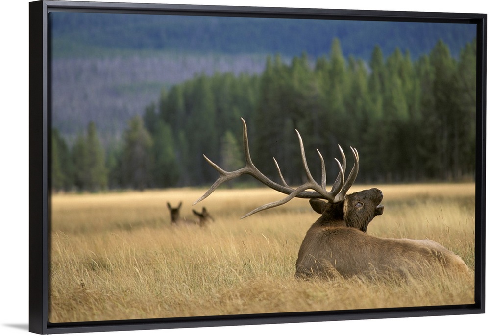 <p>Photograph of an animal from the deer family sitting in grassy meadow with two others in the background and forest in the distance.</p>