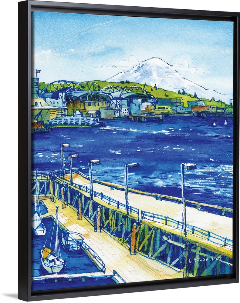 <p>Seattle's waterfront piers provide an excellent view of the blue waters of the Puget Sound. Elliott Bay is the body of water that touches downtown. We can see the iconic ferry docked at the terminal, the stadiums past Pioneer Square, and the enormous peak of Mount Rainier (Tahoma) towering above it all. Sailboats are docked in the marina in the foreground.</p>
