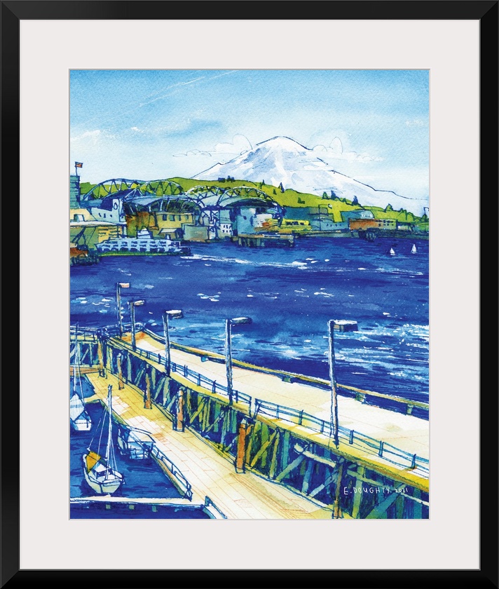 <p>Seattle's waterfront piers provide an excellent view of the blue waters of the Puget Sound. Elliott Bay is the body of water that touches downtown. We can see the iconic ferry docked at the terminal, the stadiums past Pioneer Square, and the enormous peak of Mount Rainier (Tahoma) towering above it all. Sailboats are docked in the marina in the foreground.</p>