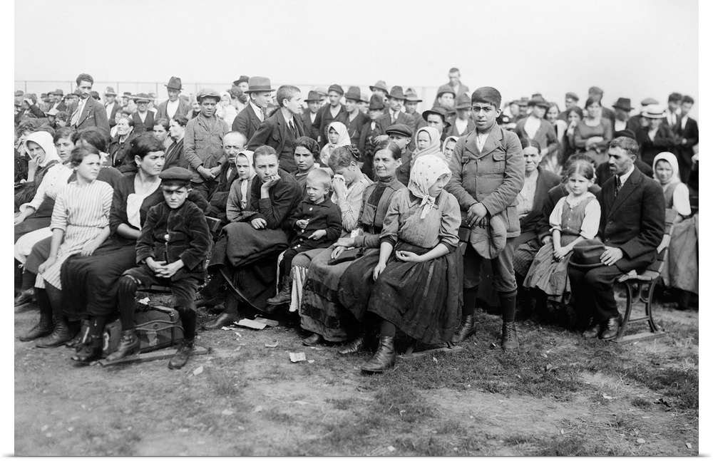 <p>Immigrants on Ellis Island waiting for a boat.</p>
