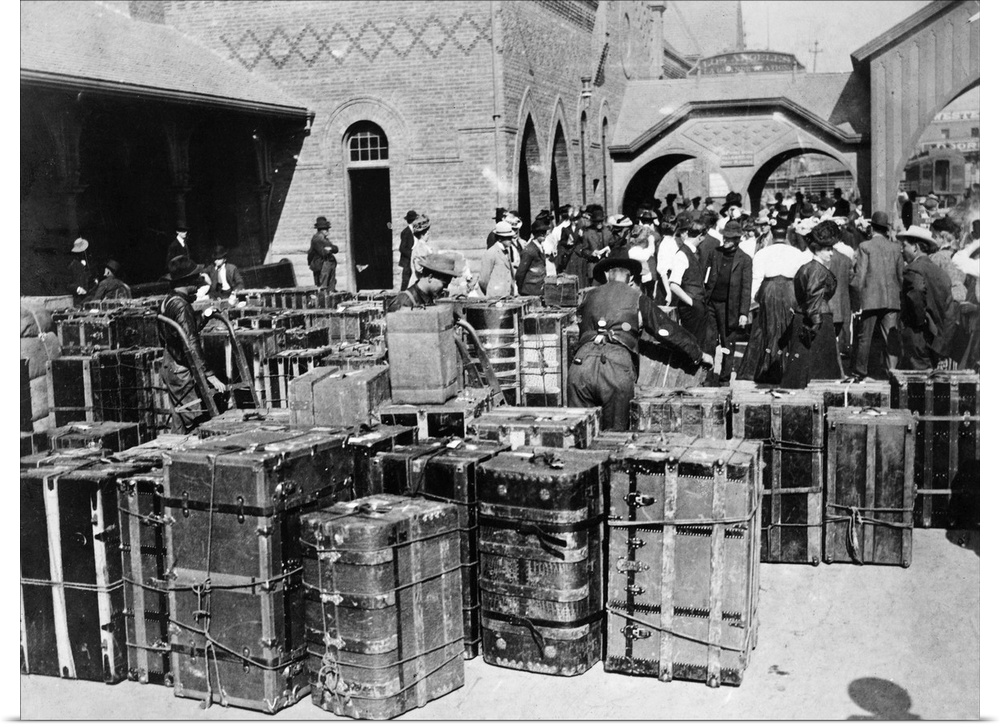 <p>Trunks at Ellis Island belonging to arrivals debarking for New York, c1900.</p>