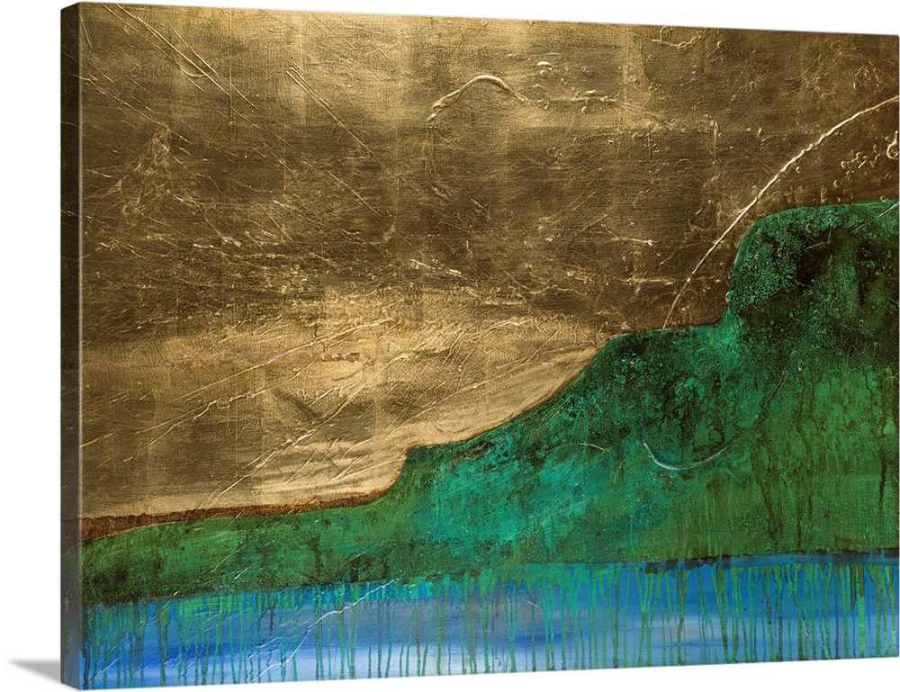 <p>Abstract landscape painting featuring a textured gold sky, vibrant green hills with drips, and a serene blue body of water with vertical paint streaks, evoking a modern, elemental natural scene.</p>