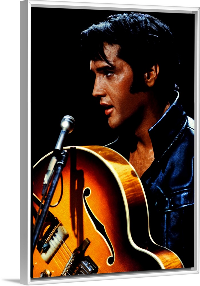 <p>Big canvas photo of an up close shot of Elvis Presley holding a guitar in front of a microphone.</p>
