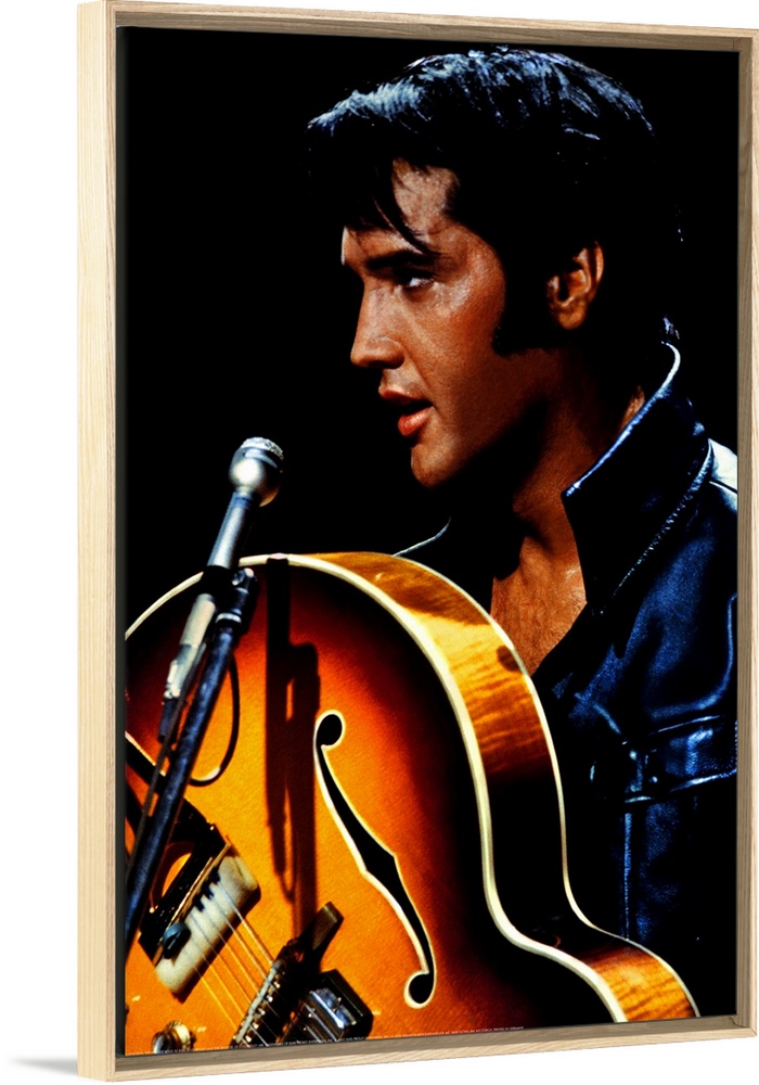 <p>Big canvas photo of an up close shot of Elvis Presley holding a guitar in front of a microphone.</p>