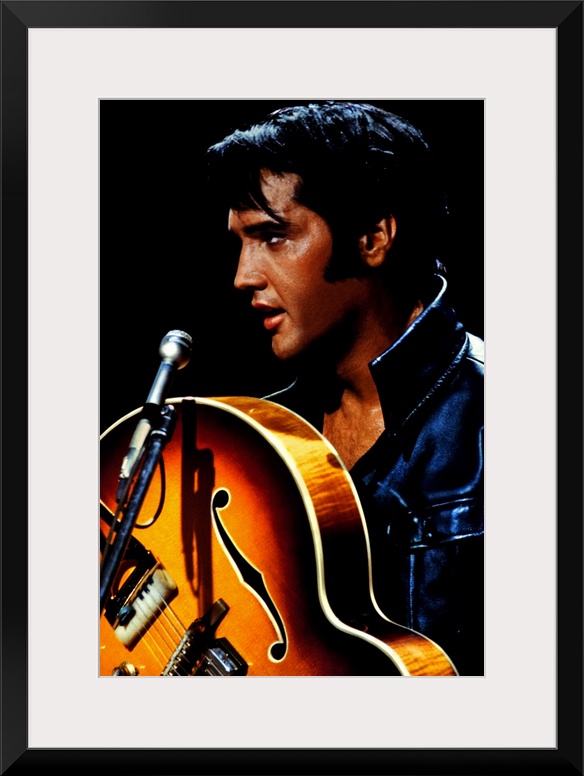 <p>Big canvas photo of an up close shot of Elvis Presley holding a guitar in front of a microphone.</p>