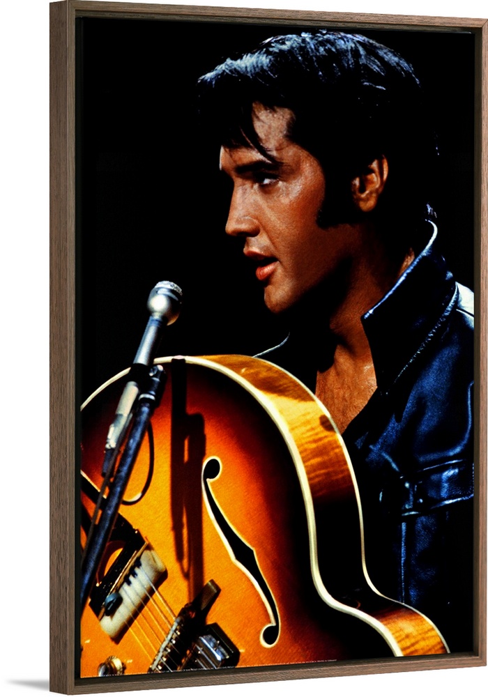 <p>Big canvas photo of an up close shot of Elvis Presley holding a guitar in front of a microphone.</p>
