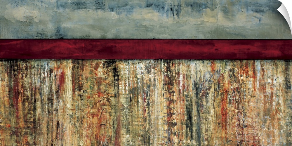 <p>Abstract painting using earth colors in a textured color field, with a dark red horizontal stripe at the top of the image.</p>