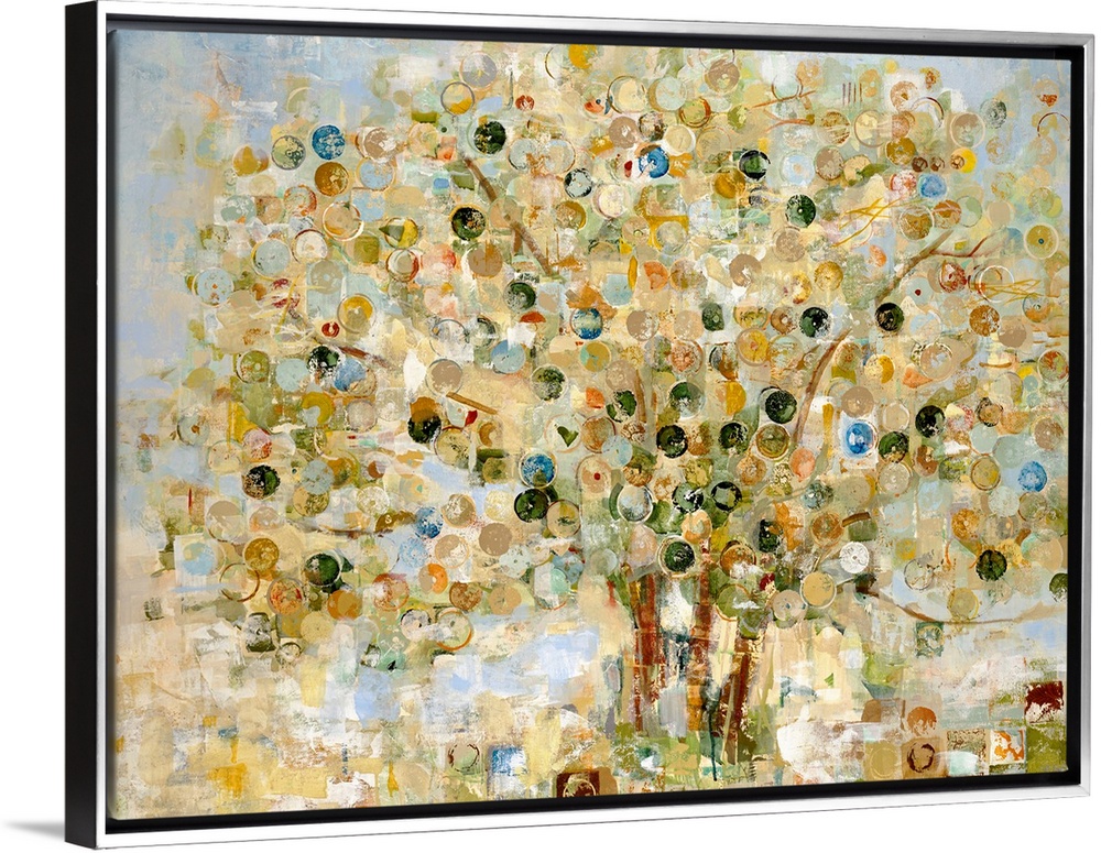 <p>Large living room decor of an abstract landscape of a tree where the leaves are represented by circles.</p>