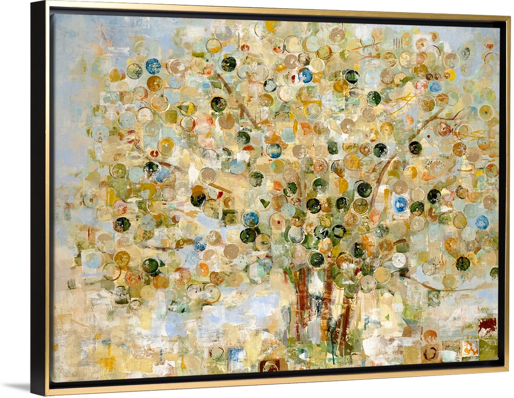<p>Large living room decor of an abstract landscape of a tree where the leaves are represented by circles.</p>