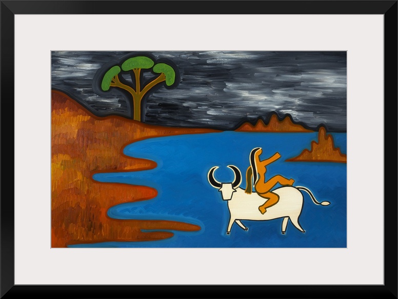 <p>Contemporary painting of a woman riding a bull in the ocean, the myth of Europa.</p>