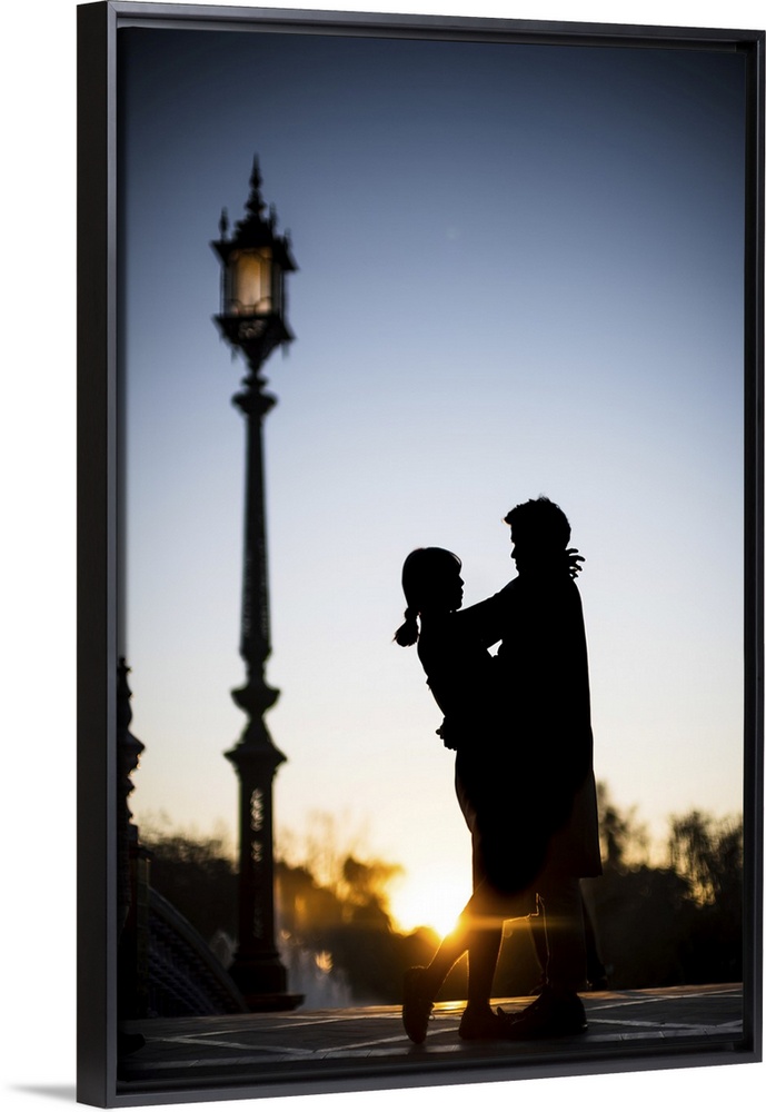 <p>Young couple embracing at sunset, Plaza de Espana, Seville, Spain.</p>