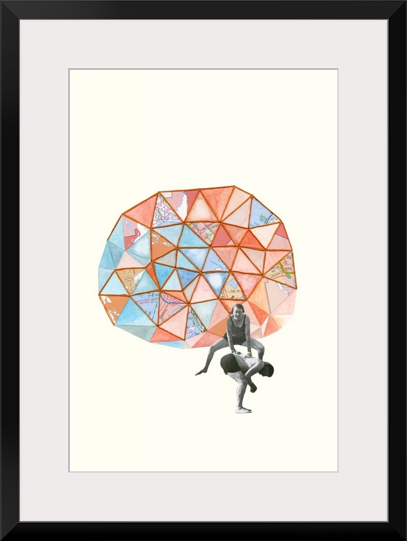 <p>Abstract art of a geometric prism created with mixed media in shades of blue, orange, and red, with a man and woman playing in the foreground</p>
