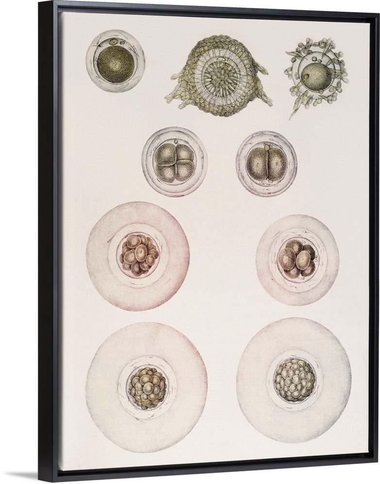 <p>Development of an embryo, historical anatomical artwork. This 19th century textbook illustration shows the sequence of stages in embryonic development, starting at upper left. The first diagram is an ovum (egg cell) removed from the ovary of a rabbit. The second and third show the process of fertilisation with the ovum surrounded by sperm cells. Once fertilised, the cell divides (central diagrams). The final diagram shows a blastocyst, or hollow ball of cells. Development takes place in the fallopian tube, as the cells travel towards the uterus. The illustration is taken from the 19th century French textbook The Atlas of Human Anatomy and Surgery by J. M. Bourgery and N. H. Jacob.</p>