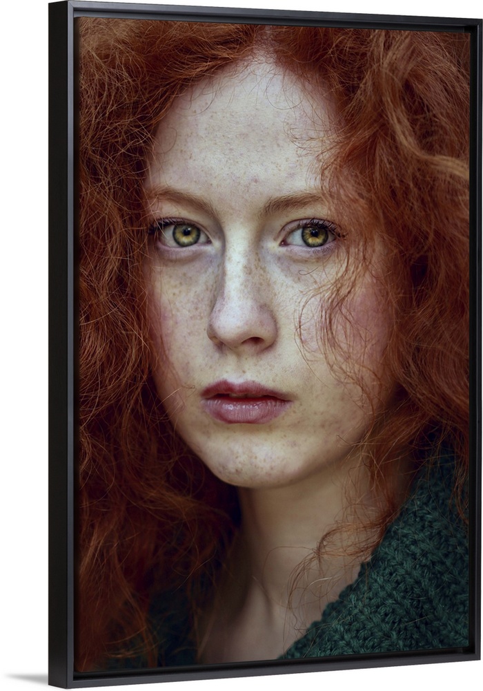 <p>Close-up portrait of female youth with red curly hair and piercing green eyes.</p>