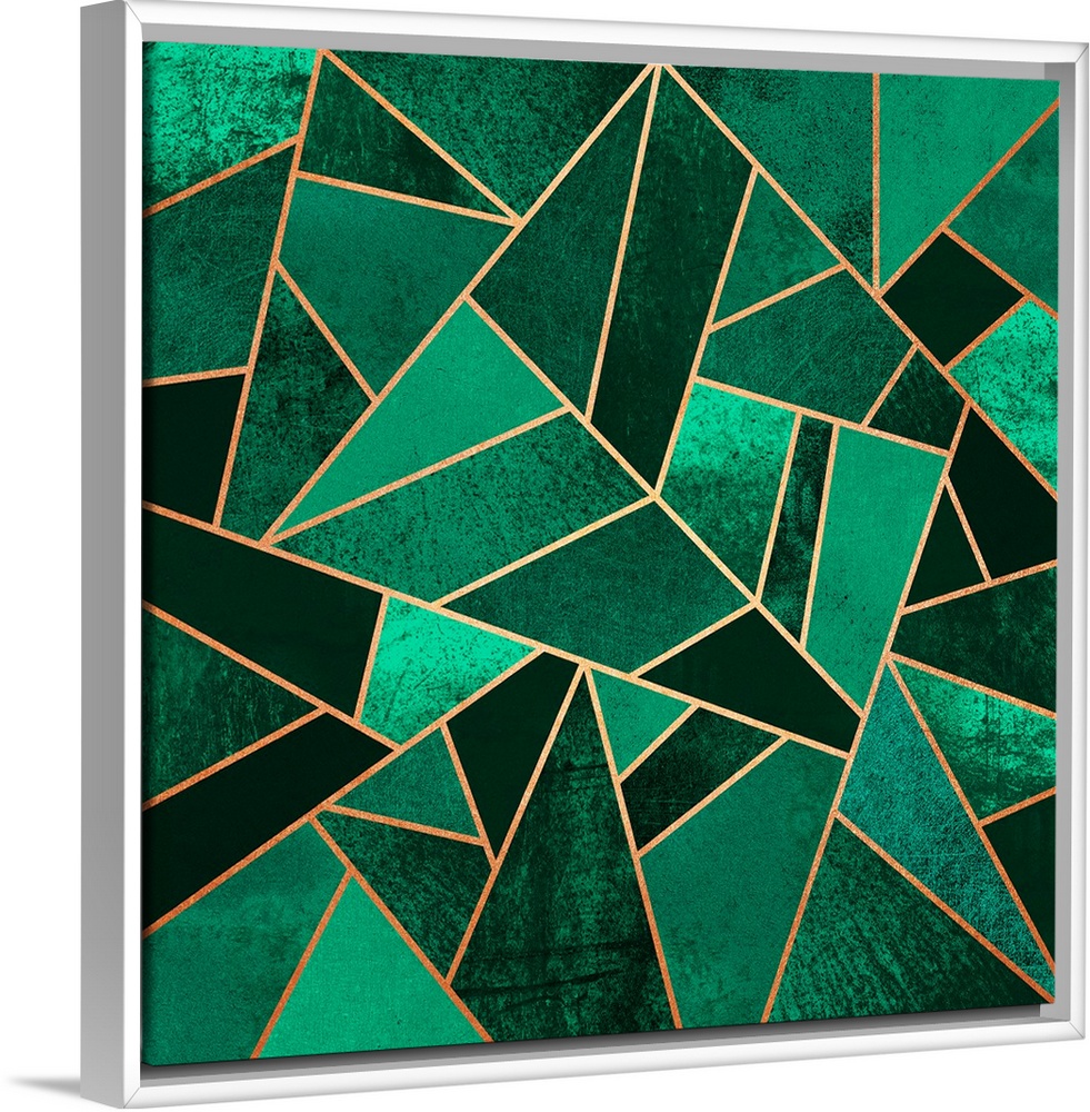 <p>A contemporary, geometric, art deco design in shades of green. The shapes are outlined in gold.</p>