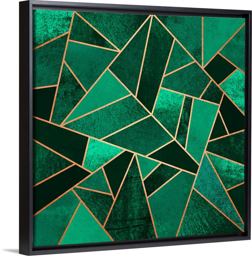 <p>A contemporary, geometric, art deco design in shades of green. The shapes are outlined in gold.</p>
