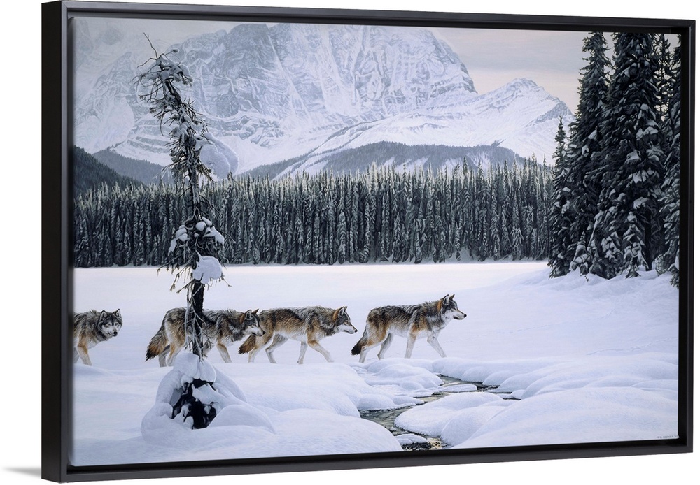 <p>Wolves crossing the lake with a small stream running through the snow.</p>