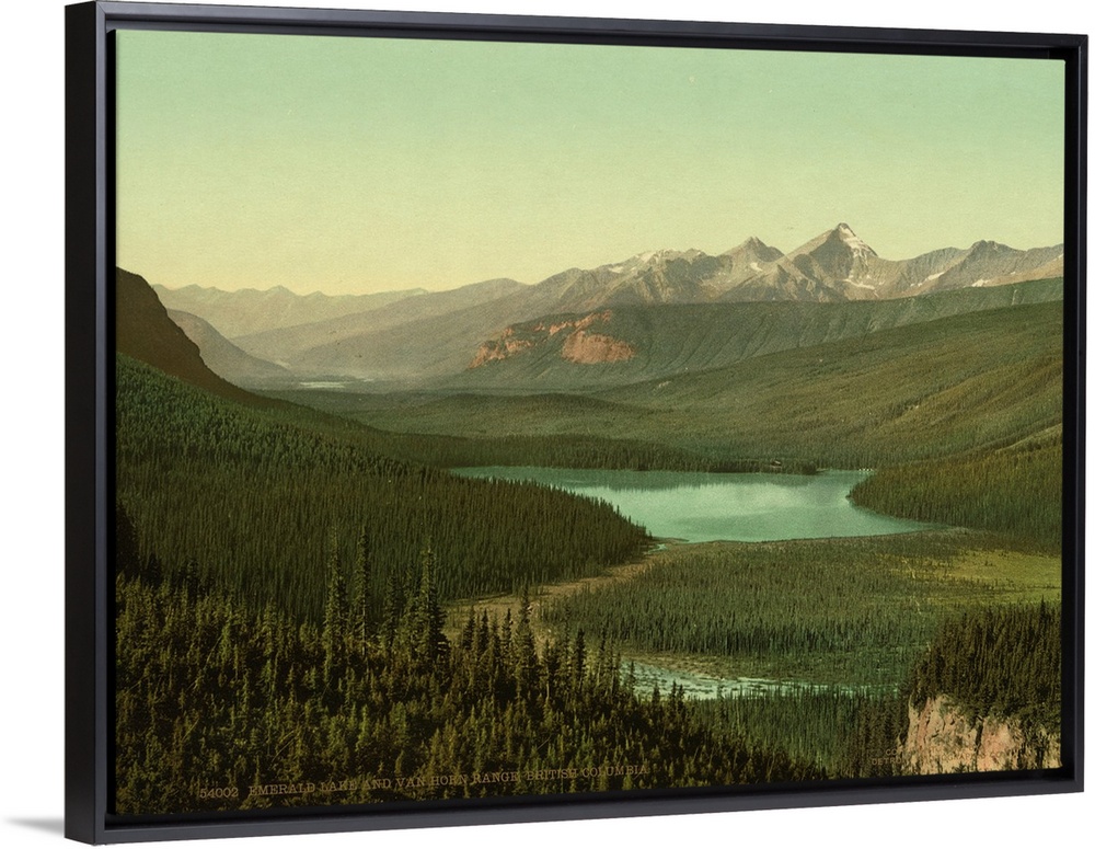<p>Hand colored photograph of emerald lake and van horn i.e., Horne range, British Columbia.</p>