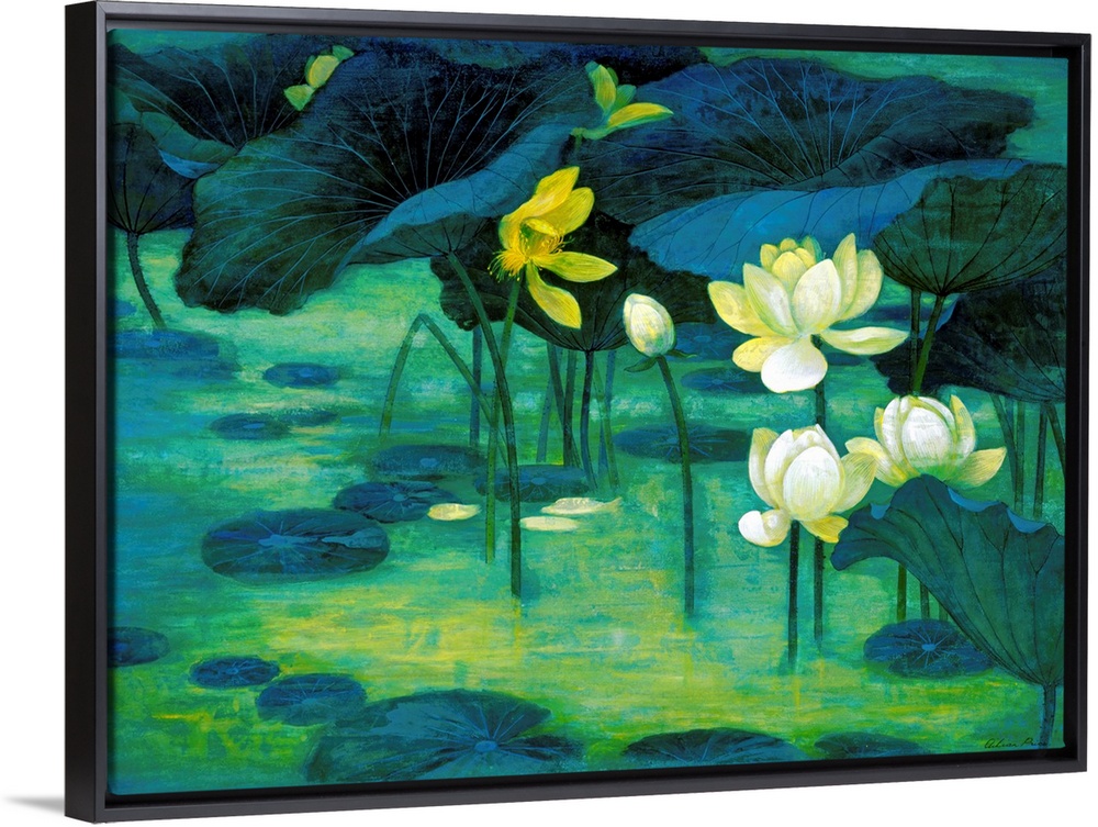 <p>Painting of lilies and flowers in a pond on canvas.</p>